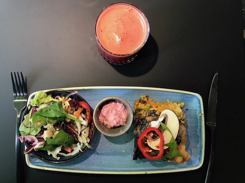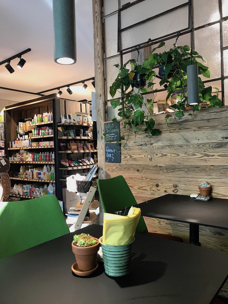 Dass sich modernes und Bio-Gedankengut sehr gut kombinieren lassen, zeigt Maria in ihrem Biotreff auf geradezu vorbildliche Weise. So gibt es beim Eingang einen Bereich der kleinen, regionalen Händlern die Möglichkeit bietet, ihre Produkte zu präsentieren. Eine Art „Pop-up-Store“, der je nach Angebot bzw. Jahreszeit entsprechend bestückt wird. Auf Reisen suchte sie nach internationalen Trends und wurde, betreffend Ladenbau, im Industrial Design fündig. Aber nicht nur der Ladenbau präsentiert sich gekonnt anders, auch die Präsentation der Bio-Gerichte lässt Stimmen, die Bio ins alternative Eck drängen wollen, sofort verstummen.