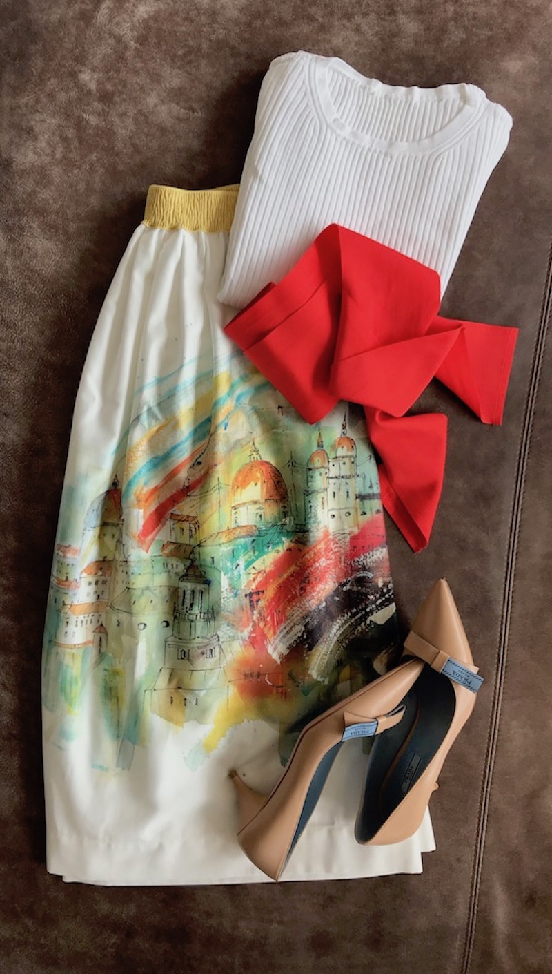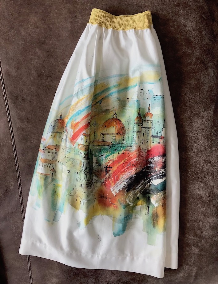 Michaela Schirlbauer, Inhaberin der Modeboutique Misc am Mozartplatz und begeisterte Salzburgerin, wollte, wie sie sagt, etwas touristisches machen. Allerdings mit Qualitätsanspruch. Und etwas das auch bei den Salzburgerinnen Anklang findet. Beim Anblick eines Salzburg Panoramafotos von Taro Ebihara kam ihr die zündende Idee. Sie lies das Motiv von der alteingesessenen Salzburger Stoffdruckerei Jordis auf einen Baumwollstoff drucken und ab ging’s ins Nachbarbundesland Steiermark. Dort wurde der bedruckte Stoff, genau nach Anweisungen von der Ideengeberin, zum Rock geformt. Figurbewusste Trägerinnen können aufatmen. Da der Rock nur vorne und hinten Falten zeigt und seitlich glatt verläuft, hält sich die erzeugt Fülle in Grenzen. Michaela Schirlbauer kennt sich eben aus mit Kundenwünschen.