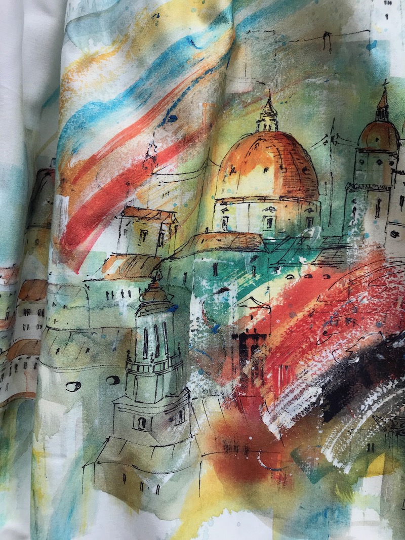 Die neutrale Grundfarbe des zart glänzenden Baumwollsatins ist in Ivory gehalten und bringt die bunten Farben der Malerei so richtig zum Strahlen. Das Motiv zeigt sich in wässrigem Hellblau, zarten Gelb das sich bis ins Orange entwickelt und feurigem Rot das dem schwarzen Pinselstrich als Kontrast dient. Viele Farben also, die zahlreiche Kombinationsmöglichkeiten bieten. Obenrum mit Bluse oder Shirt getragen, bei kühleren Temperaturen wählt man eine kurze, elegante oder lässige Jacke darüber. Ob sportlich mit Sneakern, oder schick mit Ballerina, Sandale oder High Heels ausgeführt, der Rock macht auf vielen Bühnen und unterschiedlichsten Gelegenheiten eine gute Figur. Sogar im Winter wäre er tragbar mit Rolli und Stiefel zum Beispiel. Ganz klar, ein Universalgenie, wie die Erfinderin meint. Apropos Genie. Salzburg und Genie – das passt doch!